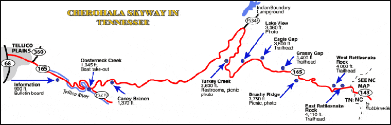 Cherohala Skyway (TN Hwy 165, NC Hwy 143) is a 43-mile national scenic byway that connects Tellico Plains, Tennessee, with Robbinsville, North Carolina. Opened and dedicated in fall of 1996, this highway starts at 800 ft. in elevation, and climbs over mountains as high as 5390 ft at Santeetlah Overlook on the state border, with 21 miles of the Skyway in southeast Tennessee and 15 miles in North Carolina. The road crosses through the Cherokee and Nantahala National Forests, thus the name "Chero...hala." Travelers on the Tennessee side are treated to mile-high vistas, brilliant seasonal foliage, the magnificent splendor of the Cherokee National Forest and the Tellico River. The rugged mountains, sparse human population and diverse habitats of Tennessee's eastern border make it home to an amazing variety of wildlife. There is little evidence of civilization from views that rival - or surpass - any from the Blue Ridge Parkway.